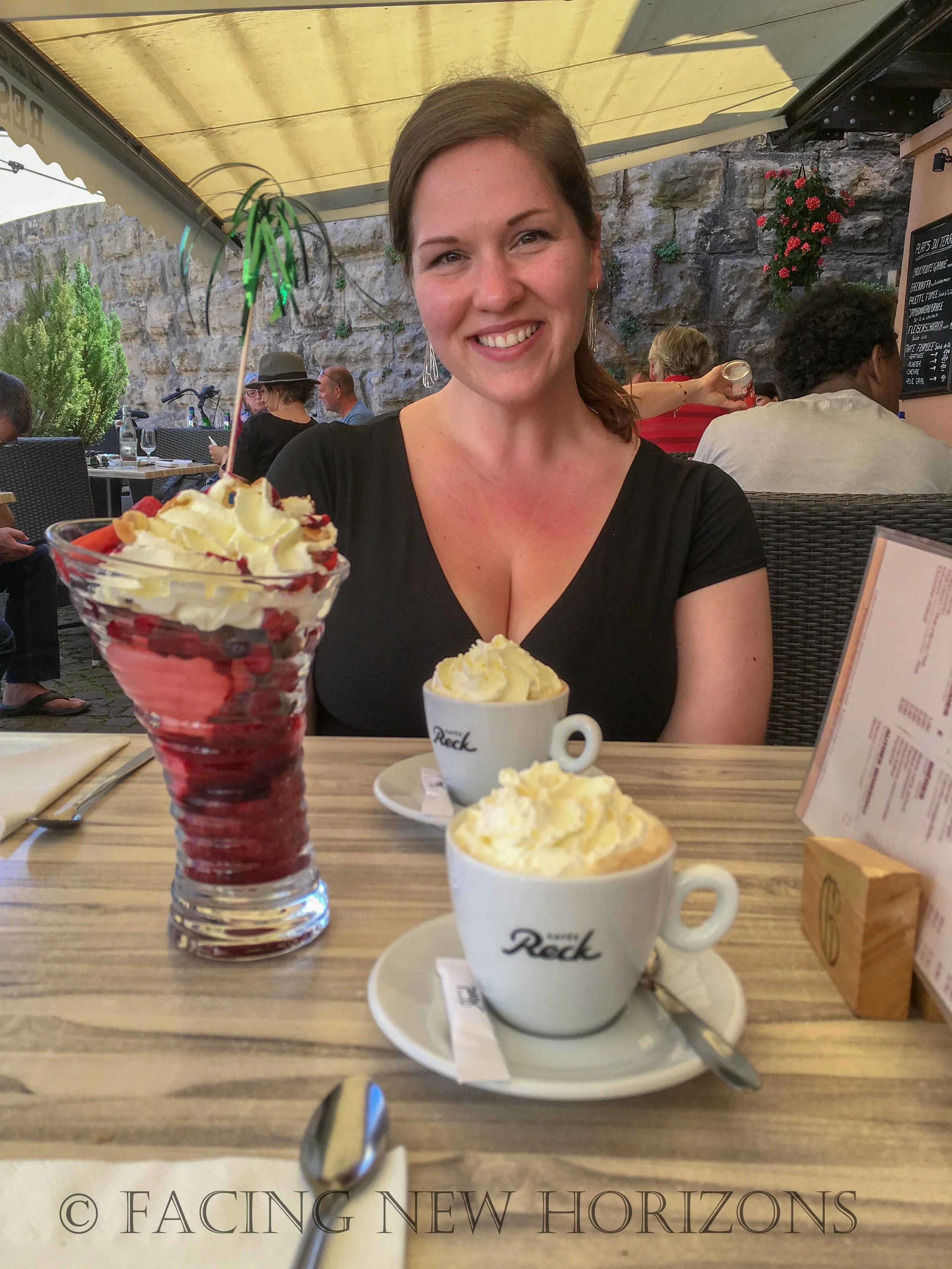 We made our way back to the center square and took an outdoor seat at Restaurant A. Edel. The church and castle are set up higher than the roads and sitting on the square gave them the impression of really towering over us. The restaurant was on its “vespers” break, though they were still serving drinks and snacks. We watched the servers deliver a magnificent berry sundae to a neighboring table, and we just had to order one ourselves! In the spirit of this little afternoon break time, we relaxed at the table and looked out over the square.